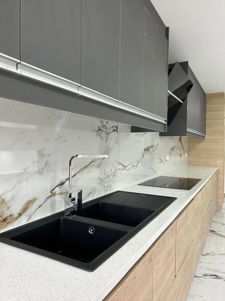 The old kitchen space, an unused room, and a bathroom that had been serving as a storage area for the past few years were utilized to create a larger kitchen. A large window facing the house's exterior patio was added to ensure good lighting and ventilation.